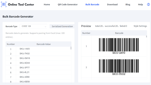 Массовое генерирование штрих-кодов онлайн бесплатно. Создайте коды 128, UPC, EAN, 39 и QR за несколько секунд. Идеально подходит для розничной торговли, складов и команд электронной коммерции.